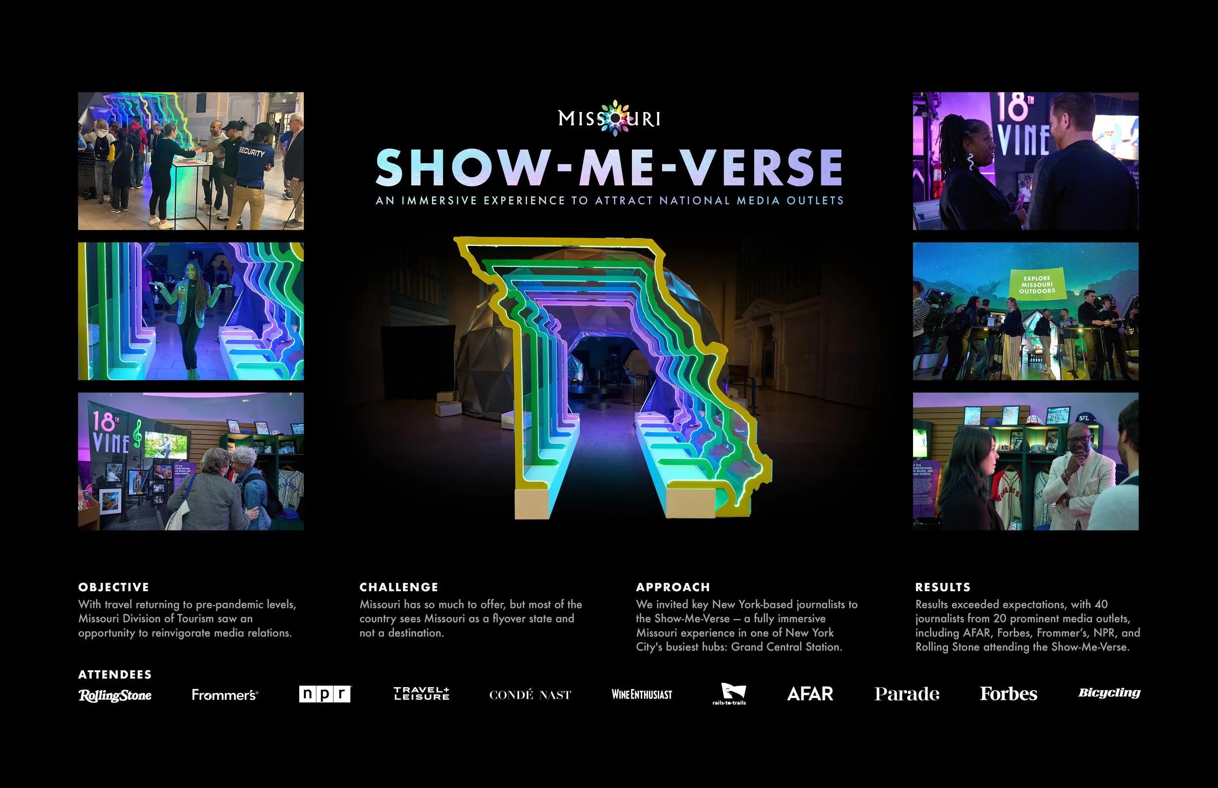 After the pandemic, the Missouri Division of Tourism sought to enhance its media relations with major travel publications in the US. The challenge lay in convincing journalists from prominent markets to personally explore the diverse variety of attractions that Missouri has to offer.